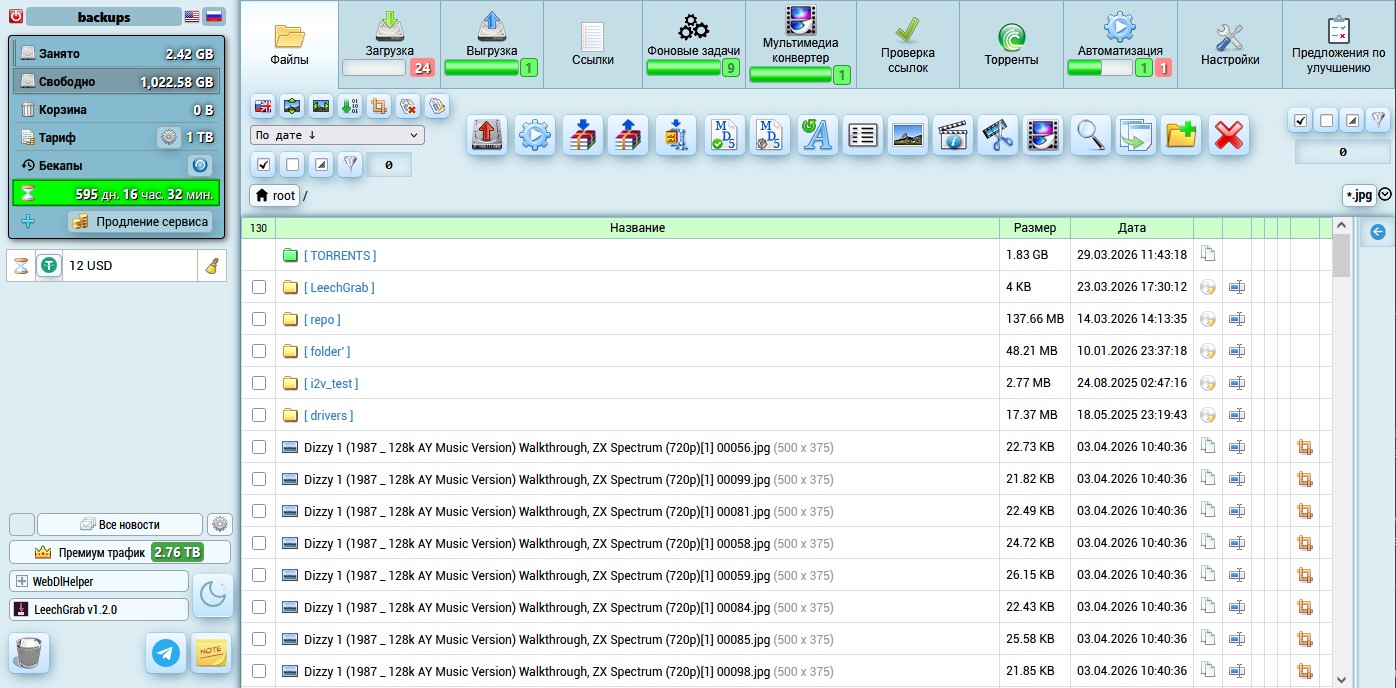 Ничего. Все задачи — скачивание, заливка, архивация, конвертация, цепочки автоматизации, торренты — выполняются на сервере в фоне. Можно закрыть браузер, выключить компьютер, прийти через час и забрать готовый результат. Отдельная вкладка «Фоновые задачи» показывает прогресс всех процессов.